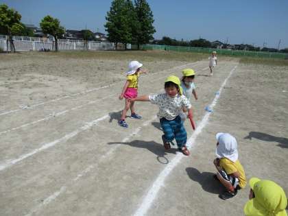 今日はピーターパン広場でリレーをしました。まずはバトンの受け渡しを確認し、みんなでやってみました。リレーはつばめ組になると1周になり、たくさん走らなければいけませんが、毎日トラックを走っているおかげで体力がつき、最後まで力いっぱい走ることができました。今日の勝負は1対1となり、悔しい気持ちも嬉しい気持ちも両方味わうことができた子供たちです。