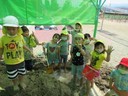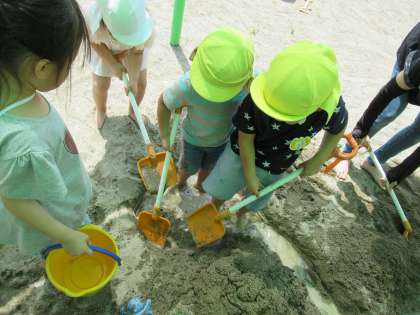 その後、園庭の砂場で裸足になって、たっぷりと砂遊びをしました。今日は深く掘って温泉をつくろう!と張り切って、友達と力を合わせてたくさん砂を掘ったり水を流したりして、足湯ができました。みんなで入って「気持ちいいねー」とニコニコ笑顔が見られましたよ。