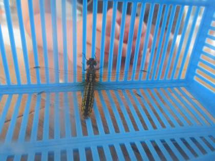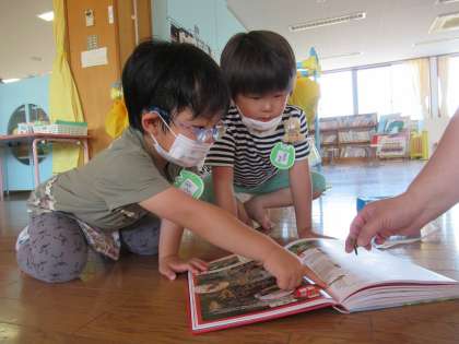 見たことがないトンボが幼稚園に飛んできました。「お腹が大きいよね」「いつものトンボより体が短い」と話し、絵本コーナーに行って昆虫図鑑を広げ、探し始めました。「これじゃない」「色が違うから、これじゃないよ」と話し合う中で、先生やつばめ組さんも加わり、『ハバヒロトンボ』じゃないかということになりました。