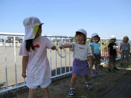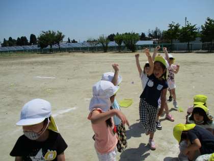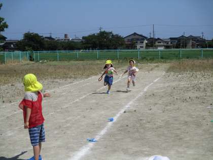 リレー頑張っているよ!(つばめ組) 公開日 2020/06/09 更新日 2020/06/09 1日の生活 6月9日(火) 今日もピーターパン広場でリレーをしました。まずは、バトンの受け渡しから。友達の手から受け取り、次の人へしっかり渡すのは少し難しい様子ですが、何回もするとだんだん上手になってきました。チームの友達と走る順番を決めて、「エイエイオー!」と元気な掛け声で気合を入れて、いざ勝負!バトンの受け渡しも上手にできて、いい勝負になりました。