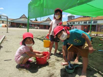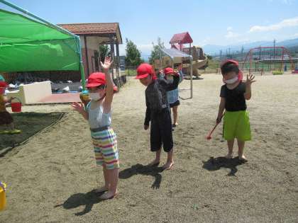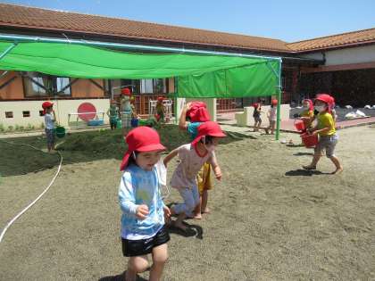 水遊び 最高!(たんぽぽ組) 公開日 2020/06/10 更新日 2020/06/10 1日の生活 6月10日(水) 暑い日はやっぱりこれ!水遊びです。最初は水に濡れることをためらっていた子も友達に誘われ、先生に誘われしていくうちにだんだんと遊びに加わり、水のトンネルをくぐったり自分から水に向かってきたりするようになりました。ミストシャワーのように降り注ぐ水に気持ちよさを感じ、満喫した子供たちでした。