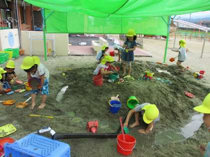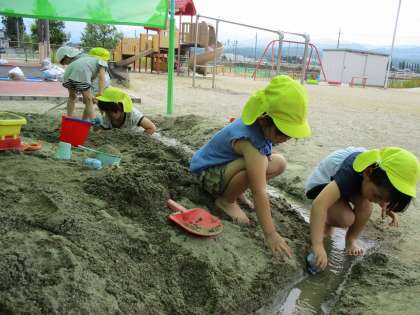 砂遊び(つばめ組) 公開日 2020/06/11 更新日 2020/06/11 1日の生活 6月11日(木) 今日は朝から園庭に出て砂遊びをしました。先週からの続きで穴を掘って道をつくったり、水を汲んできて流したりして友達と力を合わせてつくっていました。大きな穴を掘って水を溜めて足を入れると「冷たいけど、温泉みたい」「もっと大きくて深い穴にしよう」と一生懸命掘っていました。雨どいから水を流している子は、「本物の滝みたいになった」といくつも組み合わせて楽しんでいました。