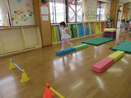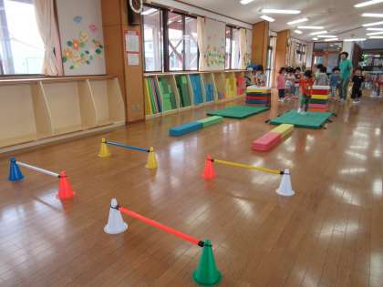 オープンスペースで、男の子チームと女の子チームに分かれて競走しました。「頑張れ!」「タッチ、ここだよ。待ってるよ」と応援し、1回戦は男の子チームが勝ち、2回戦は女の子チームが勝ちました。今日の勝負は引き分け!「また、しよう」「今度は勝つぞ」と意気込み十分でした。