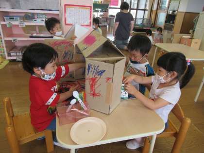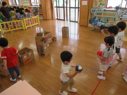 今日のほし組 公開日 2020/06/12 更新日 2020/06/12 1日の生活 6月12日(金) 今日は昨日のボール遊びの続きをしました。鬼の顔を箱に描いて、ボールを当てたり、箱を狙ったりして遊びました。恐い鬼やかわいい鬼がたくさんできました!また、どれだけ遠くまで投げられるか競争もして遊びましたよ。 そして最近ほし組ではお店屋さんごっこが流行っています。自分で料理を作ったり、お店をデザインしていてとっても楽しそうですよ!