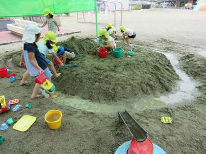 今日も先週の続きで砂場で温泉や川をつくって遊びました。最初は少し生ぬるい水でしたが、たくさん入れると段々冷たくなってきて大喜びの子供たちでした。