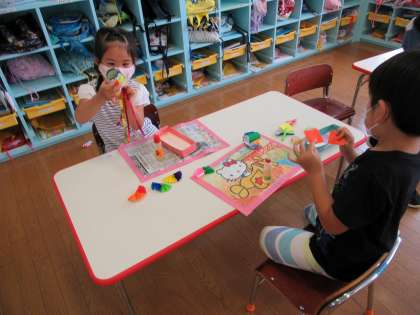 七夕飾りの製作もしましたよ。キラキラのテープがつくと「わぁーキレイ!」と嬉しそうに眺めていました。笹に飾るのが楽しみです。