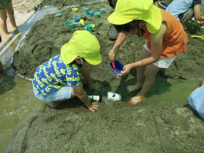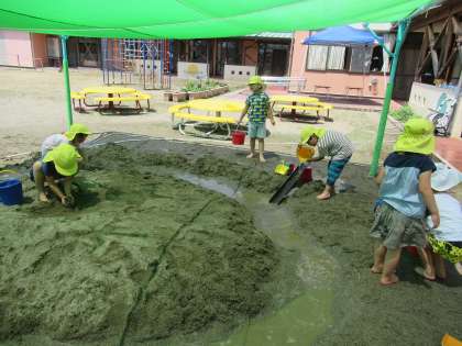 今日も園庭で水遊びを楽しみました。雨樋を使って水を流したり、船に見せた新幹線を浮かべ、どうやったら進むかな…とシャワーをかけてみたり、水圧を変えてみたりと、友達と一緒に試しながら遊ぶ姿が見られました。水鉄砲で的を狙って打つことも楽しかった様子の子供たちでした。