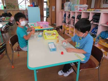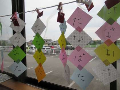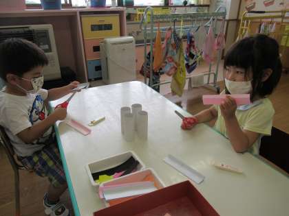 先日から七夕飾りづくりを少しずつ始めています。今日は、織姫と彦星をつくりました。トイレットペーパーの芯を利用して、顔の部分を折り紙で貼ったり、洋服の部分をハサミで直線切りにして飾り付けたりしました。「たなばた」の文字も自分で書きました。
