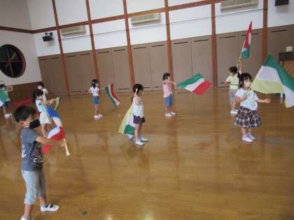 今日は初めてのフラッグに挑戦しました。フラッグを見せると「かっこいい」「外国の旗みたいだね」と嬉しそうな子供たち。みんなで旗を持って構えたり、旗を振ってみたりと初めてのことに「楽しい!」「結構簡単だね」とニコニコしながら取り組んでいました。片手でフラッグを持つ時は、少し重そうにしている姿もありましたが、「明日もやりたい!」「次はどんなのかな」と楽しみにしている子供たちでした。