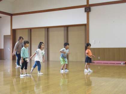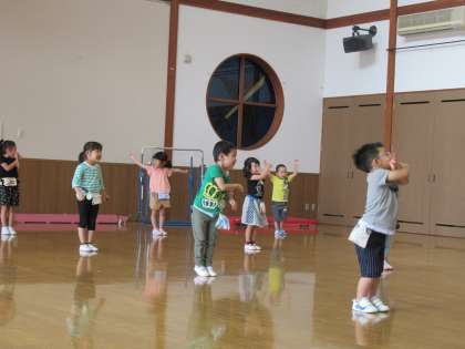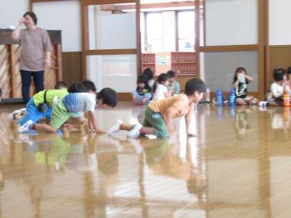ラジオ体操で体をほぐし、両足ジャンプやワニ歩きなどの運動遊びをした後、子供たちの大好きなだるまさんころんだをしました。