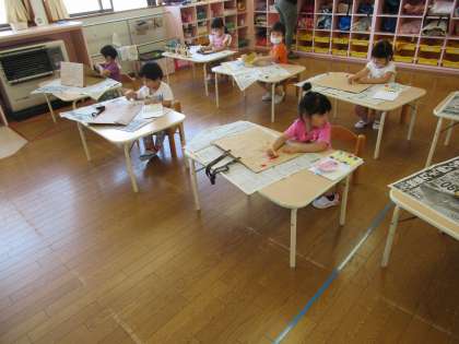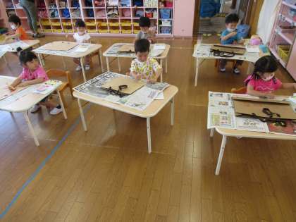 今日は紙袋を背負ってカタツムリの真似をして遊びました。カタツムリの家は無地で寂しかったので、みんなで絵を描きました!好きな色でぐるぐると色を塗る子や、花を描いたり、イチゴを描いた子を見て「僕も描きたい!先生描いて!」と話したりする子もいました。カラフルで可愛い家になりましたよ!