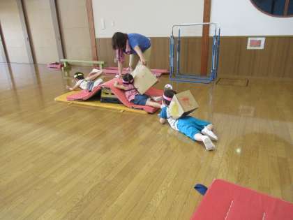 今日は昨日作ったカタツムリの家を背負ってプレイルームで遊びました。カタツムリになって坂を登ったり降りたり、平均台を渡ったり、“かたつむり”の歌を歌ったり、可愛いカタツムリが沢山プレイルームを散歩していましたよ!