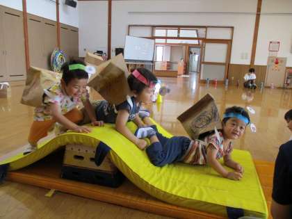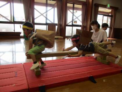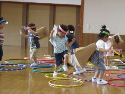 カタツムリの散歩(ほし組) 公開日 2020/06/25 更新日 2020/06/25 1日の生活 6月25日(木」) 今日は昨日のカタツムリの散歩道にフープのトンネルができたり、フープの家に入ってご飯を食べたりしたカタツムリがいました。何を食べたか聞いてみると、カブやニンジン、キャベツ、リンゴ、バナナを食べていたそうです!フープの家がたくさんできると、ジャンプをして引っ越しをしたりするカタツムリもいましたよ!