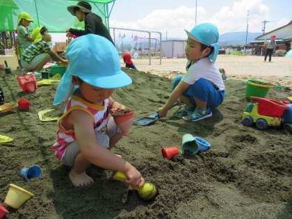 今日はシャボン玉をして遊びました!初めてシャボン玉をする子もいて「ふーっ」と言いながら吹いていましたが、だんだん上手に膨らませるようになっていましたよ!他にも勢いよく吹く子や、ゆっくり吹いて大きなシャボン玉をつくっている子もいました。また、砂場では年中さんや年長さんに混ざって遊びを楽しんでいました!