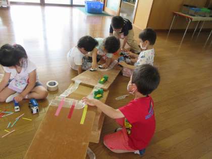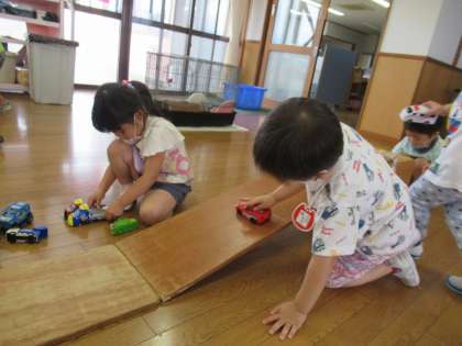 今日のほし組は、積み木の坂道に車を走らせて遊んでいました。「3・2・1ゴー!」と言って車を出発させている子もいましたよ!新しい積み木を持って来ると「こうするんだよ」と友達に話しかけながら、自分たちで考えて組み立てたり、危ないところは先生と一緒にテープを張る手伝いをしながら、とても楽しそうに遊んでいました!