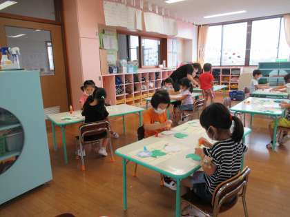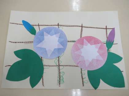 アサガオをつくりました(たんぽぽ組) 公開日 2020/07/01 更新日 2020/07/01 1日の生活 7月1日(水) 色画用紙にクレヨンで柵を描いた上からクルクルとツルを描き、アサガオを貼る台紙をつくると、先日つくったアサガオを貼りました。葉とアサガオを貼る場所をどうすればいいのかと試行錯誤しながら貼ってました。たんぽぽ組にたくさんの素敵なアサガオが咲きました。