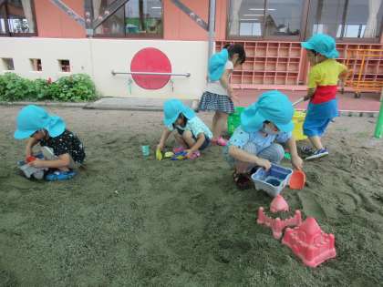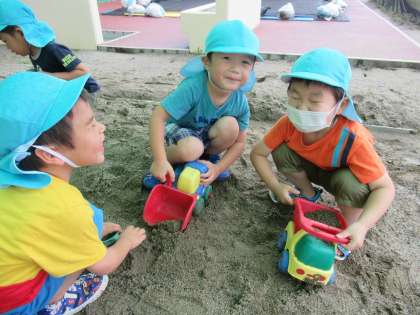 今日はほし組で飼っているカタツムリの飼育ケースに入れる、葉っぱや石、枝を探しに行きました。「これ食べるかな?」と大きな葉っぱを拾っている子や、「石見つけたよ!」と持って来てくれる子もいました。(子供たちと一緒に一生懸命探してしまい、写真がなくてごめんなさい。)カタツムリの家に入れる物を見付けた後は、砂場でも遊びました。ブルドーザーで山を平らにして遊んだり、お城に砂を入れたり、楽しそうに遊んでいましたよ!
