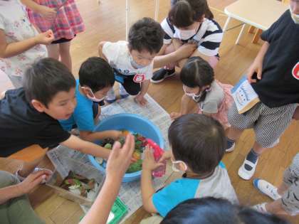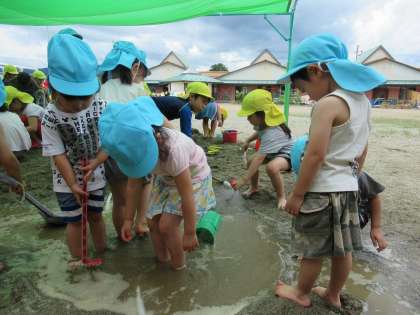 今日は、昨日集めた材料で家をつくりました。カタツムリを潰さないように石や葉っぱをそーっと入れてあげました。カタツムリが脱走しそうになって、子供たちと一緒に中に入れようとしましたが、恐くてなかなか触れない子や、ドキドキしながらも殻を持って家に入れてあげる子、体に少し触って「ふわふわしてた!」と言う子もいました。家が完成した後は砂遊びに混ぜてもらい、一緒に川をつくったり、入ったりして楽しそうに遊んでいましたよ!