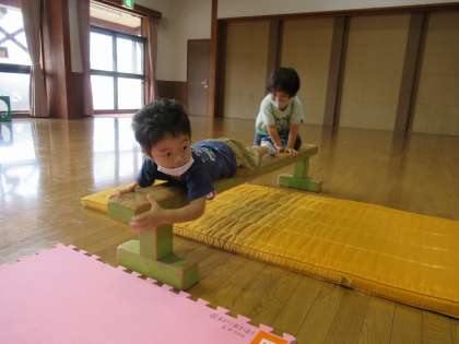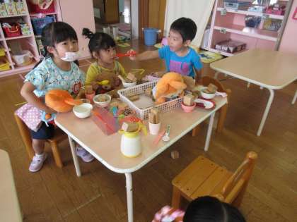 今日は久しぶりにカタツムリごっこをして遊びました。今日はフープを回すカタツムリも出てきて、とってもにぎやかなカタツムリごっこになりましたよ!また、最近ほし組ではパーティーがよく開かれています。ぬいぐるみの赤ちゃんも参加していて、とても楽しそうですよ!