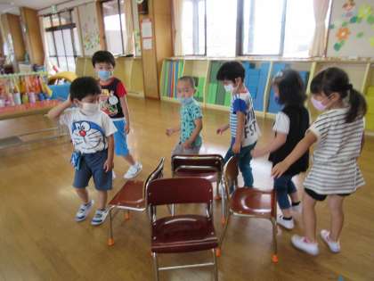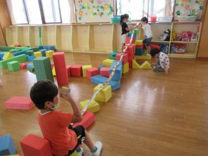 たくさん遊んで楽しかったよ(たんぽぽ組) 公開日 2020/07/09 更新日 2020/07/09 1日の生活 7月9日(木) ピタゴラ装置に椅子取りゲーム。ウレタン積木でお家ごっこと今日も一日フル回転。「今日は○○して遊ぼう」と決めてくる子も多く、友達を誘って遊んでいます。「明日もしようね」と約束する姿も見られ、友達と遊ぶことがうれしくて仕方ない様子です。