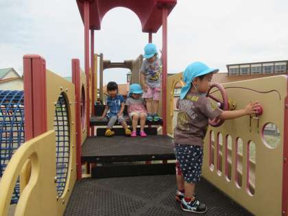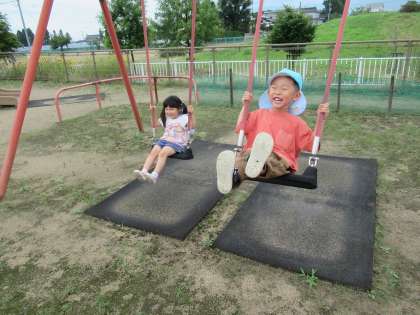 今日は久しぶりに雨が上がっていたので外で遊びました。砂遊びで一生懸命工事をしたり、ブランコに乗りながら空を見上げて鳥に「バイバーイ!」と言ったり、バスごっこをしたりする子もいて、久しぶりに外で伸び伸びと遊べて、とても楽しそうでした!