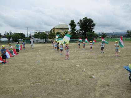 今日はピーターパン広場でフラッグとリレーをしました。フラッグは各グループごとに見合い、それぞれのグループの良いところや、もっとこうしたら格好良く見えると思うところを伝え合いました。リレーではそれぞれ話し合い、相手チームに順番が聞かれないように小さな声で話したり、作戦を立てたりしていました。今日の2回目は接戦で、初めて引き分けとなり、応援する方にも力が入りました。