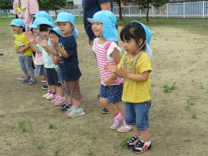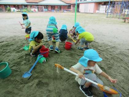 今日は砂遊びをしました。バケツに砂を詰めてホットケーキをつくったり、お城をたくさん並べて街をつくったりして遊んでいました。また、今日はつばめ組さんのリレーを見せてもらいました。お兄さん、お姉さんがかっこよく走る姿にみんな興奮して、一生懸命応援していました。あとでほし組もかけっこをしてみると、みんなつばめ組の真似をしてかっこよく走っていましたよ!