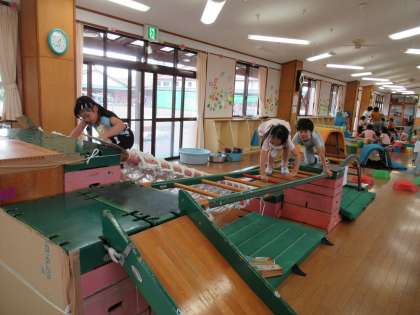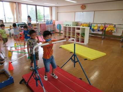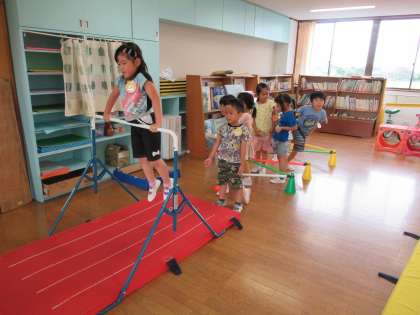 年長組さんから修行カードをもらい、今日は学年ごとにさまざまな修行に挑戦しました。頑張るとカードにシールをもらえるということもあって、いつも以上にはりきる子供たち。両足ジャンプをし、鉄棒にぶら下がり、平均台を渡り、マットの山を越え、足ツボをしと、たくさん体を動かして遊びました。