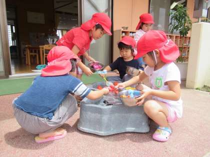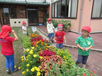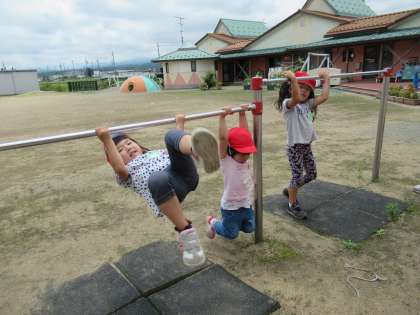 天気も良かったので、仲良し広場で遊びました。蝶やカエルを見付けて「先生、虫取り網ある」と聞かれたので準備すると、見付ける子、捕まえる子に分かれ、協力して捕まえようとしていました。鉄棒に挑戦したり、金魚すくいをしたりと自分の遊びたい場所でたくさん遊びました。