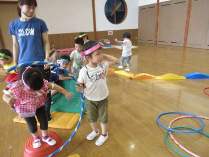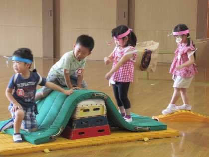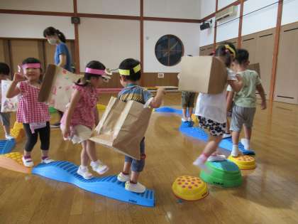 カタツムリごっこ!(ほし組) 公開日 2020/07/22 更新日 2020/07/22 1日の生活 7月21日(火) 今日は、幼稚園の育成会より購入して頂いたウェーブバランスを使って、カタツムリごっこをしました。みんなでつなぎ合わせて道をつくり、何度も繰り返し散歩をするカタツムリさんでした。丸いウェーブバランスでは跳んでみる子もいてとても楽しそうでした!育成会のみ皆様ありがとうございました。