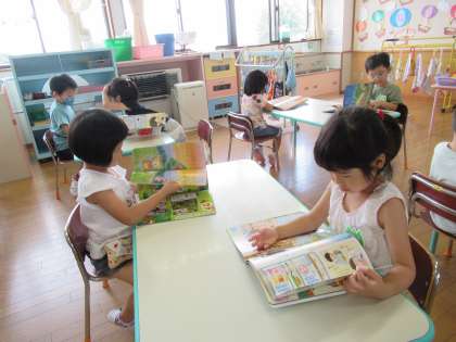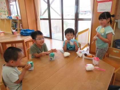 今日のたんぽぽ組 公開日 2020/07/22 更新日 2020/07/22 1日の生活 7月22日(水) お店屋さんごっこをしました。焼きそば、たこ焼き、わたあめの他にかき氷も仲間入り。「おいしそう」「本当に食べたくなってきた」と食べる真似をしながら、友達との会話を楽しんでいました。8月の月刊誌を読んだり、外で遊んだりと、時間いっぱい遊びました。