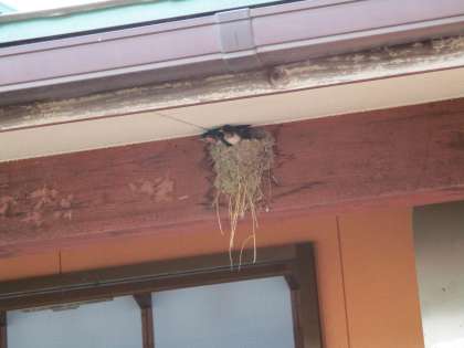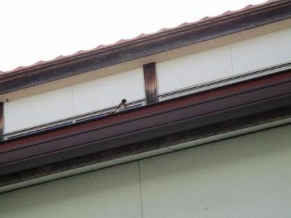 幼稚園にあるツバメの巣から顔を出しいる赤ちゃんツバメは少し大きくなり、跳ぶ練習をしているようです。体の小さなツバメが屋根の上で一休みしていました。何度も練習をして上手に跳べるようになっていくのが楽しみです。