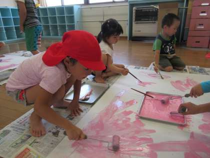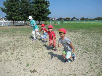 登園日2日目。今日は、朝一番でピーターパン広場に行き、かけっこをしてきました。久しぶりに走ったのですが、構えもバッチリ決まり、力いっぱい手を振って走っていました。水分補給をした後、大きな白い段ボールに色を塗ったり、運動会の踊りをしたりして、水遊びをしました。汗もスッキリしました。