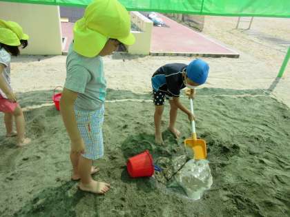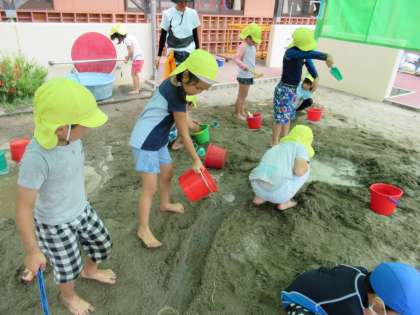 今日は夏休み最後の登園日でした。お家の方と一緒に草むしりをしたり、応援合戦の言葉をチームで考えたりし、最後の水遊びを楽しみました。今日はプールに入って涼んだり、砂場で落とし穴や川づくりをしたりして喜んでいた子供たちです。