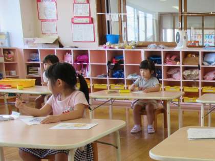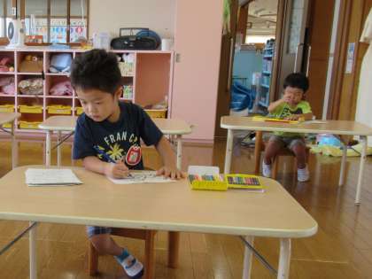今日から2学期です。ほし組でも少しずつ運動会に向けた活動を始めています。今日は子供たちを誘って、部屋に飾る塗り絵に色塗りをしました。万国旗のようにして部屋に飾って、運動会らしくなるといいなと思っています。みんな真剣に色を塗っていましたよ!また、できあがった塗り絵を友達に見せて「かわいいね」と褒められて嬉しそうにしていた姿がとても印象的でした。