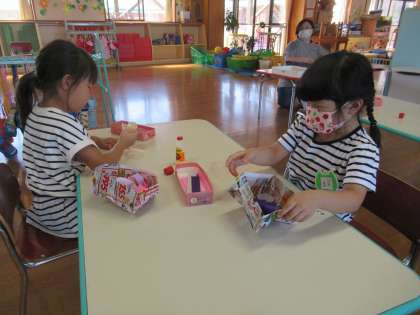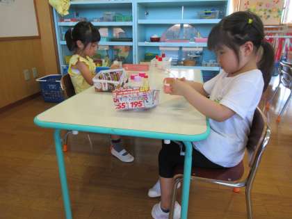 ブドウをつくりました(たんぽぽ組) 公開日 2020/09/02 更新日 2020/09/02 1日の生活 9月2日(水) 梨やブドウなど、秋の果物を口にする機会が増え「もう食べたよ」と教えてくれた子もいました。話をする中でブドウ狩りやリンゴ狩りの話が出て「幼稚園でもブドウ狩りしよう」と盛り上りました。たんぽぽ組の部屋をブドウでいっぱいにしようと、みんなでブドウをつくりました。どんな風になっていくのか、今から楽しみですね。