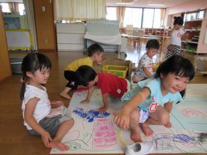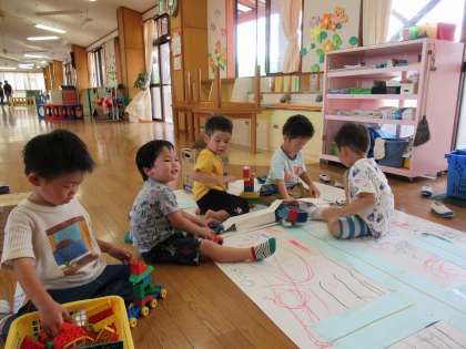 今日は昨日の続きでほし組の街をつくりました。街には消防署や陸橋も建てて、さらに賑やかになりましたよ!手作りの車をつくった子もいました。「パトカーみたいにしたい!」とランプの赤い色を付けたり、「私は青い車がいいな」と話してくれたり、みんな思い思いの車をつくりました。みんなでつくった街で明日もまた遊ぼうね!