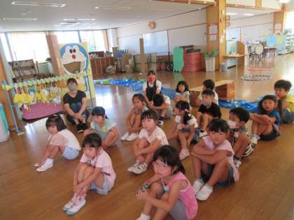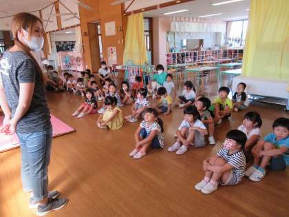 今日の訓練は、近隣にクマが出没したという想定で行いました。最近、ニュースでも少しずつ聞かれるようになってきました。「クマを見たら、近付かないで静かに離れる」「園庭にいるときはすぐに園舎に入る」という約束をしました。