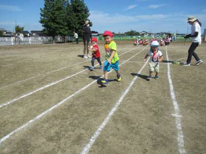 青空の下、運動会に向けて、フラッグやかけっこ、開会式や閉会式をしました。ピーターパン広場でのびのびと体を動かし、たくさんの応援に張り切る子供たちでした。