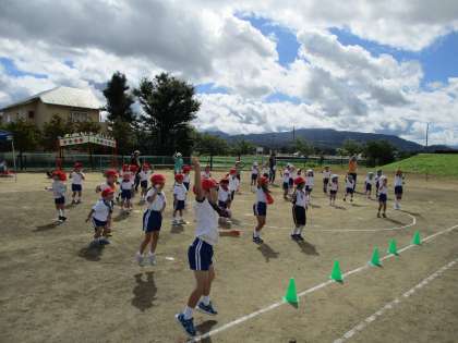 なかよし運動会予行練習 公開日 2020/09/14 更新日 2020/09/14 1日の生活 9月14日(月) 今週末はいよいよ運動会です。今日は、みんなで最初から最後まで通して演目を行いました。まずは、年長組のフラッグ。開会式や準備体操もしました。