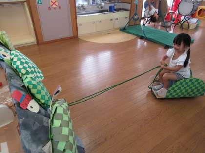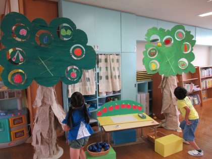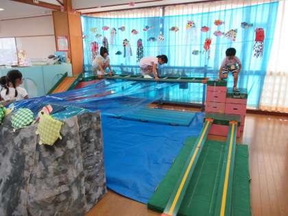 今日は「あつまれ!おおくぼのもり」の色々なコーナーに行ってみんなで遊びました。各コーナーの遊び方を共通理解し、好きなコーナーでじっくり遊ぶ子供たち。フルーツ的当てでは、20秒以内にいくつフルーツを当てられるか挑戦しました。今日の最高記録は9個でした!海のアスレチックや亀乗りも喜んで何度も挑戦していましたよ。化石取りも夢中になり、取った化石を博物館に持って行くことを楽しんでいました。