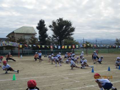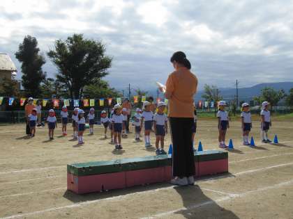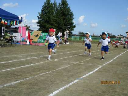 なかよし運動会 パート2 公開日 2020/09/19 更新日 2020/09/19 1日の生活 9月19日(土) 開会式では、園長先生から「みんなで頑張りましょう」とお話しされました。準備体操もしっかりして、全速力でかけっこに挑みました。