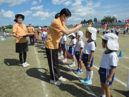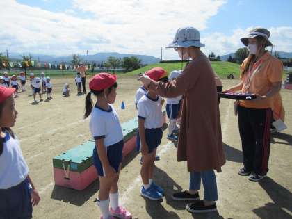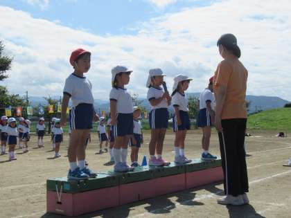 なかよし運動会 パート6 公開日 2020/09/19 更新日 2020/09/19 1日の生活 9月19日(土) 閉会式では、年長組さんが今日頑張った証にピカピカの金メダルをいただきました。 保護者の方々には朝早くからご協力いただき、ありがとうございました。ご家庭でたくさん子供たちを褒めてあげてくださいね。