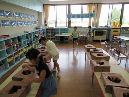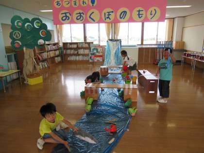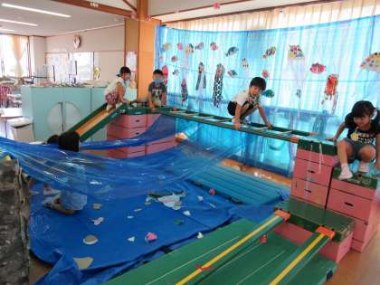 今日もおおくぼのもりでたくさん遊びました。友達と一緒に魚を釣ったり、化石を取ったり、アスレチックで遊んだりして大喜びの子供たち。素潜りのコーナーでは人魚になったり、友達に踏まれた魚やカメを助けてあげ「浦島太郎みたいだね」と言ったりして楽しんでいました。