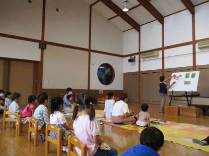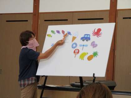 今日の親子サークルは、吉野絵美先生のパネルシアターでした。「とことこぼうし」「へんてこ もぐもぐ かいじゅう」「ふわりくも」「あかずきんちゃん」等、音楽や歌に合わせて楽しく見ました。幼稚園の子供たちも一緒に参加し、一緒に歌を口ずさんだり、クイズに答えたりしながら楽しい時間を過ごしました。