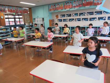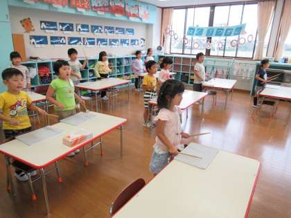 今日は初めて絵譜を見ながら声を出して読んだり、音楽に合わせてバチ打ちをしたりしました。1題目だけを何度かやってみると「楽しい」「もう1題目終わったの」と嬉しそうな子供たちでした。