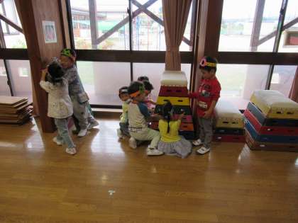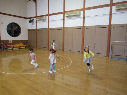 今日はトンボの眼鏡をつけてトンボになって遊びました。鬼になったトンボが言った色を見付けて、捕まらないように時間内にタッチしました。「僕、すごく速いもん!」と嬉しそうに話す子や、「こっちだよ!」と色がある場所を教えてあげる子もいて、とても楽しそうでしたよ!