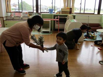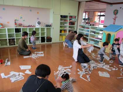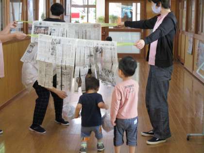 今日の親子サークルは、新聞を使って遊びました。ビリビリ破ったり、ナイロン袋に入れてボールにしたり、新聞のカーテンンをくぐったりして、新聞遊びを楽しみました。