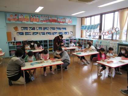 今日はつばめ組になって初めての保育参観でした。おおくぼのもりでお家の方と一緒に遊んだり、つくったものを見せたりすることを喜んでいた子供たちでした。運動遊びではできるようになったこと、頑張っている姿を見てもらったり、補助をしてもらったりしました。朝の会や、ハロウィンの飾りの折り紙製作の様子など、普段の活動をたくさん見てもらうことができました。子供たちはお家の方が来てくれ、とっても嬉しそうでしたよ。