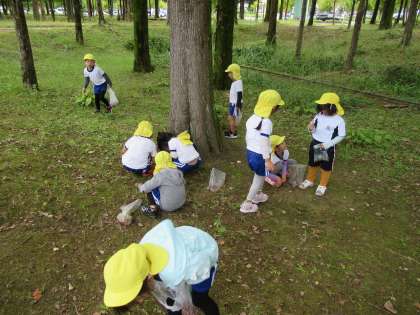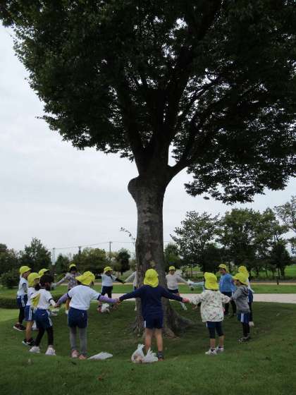 つばめ組は、まず最初に散策に行きました。色々な形や大きさのどんぐりやきれいな葉っぱを見つけてたくさん拾ってきました。展望台にも上り、上からほし組さんを見つけて大喜びの子供たちでした。途中で大きな木を発見し、みんなで手を繋いでみました。少し手が届かず、みんなで少しずつ近づき円ができると「やったー」と嬉しそうでした。